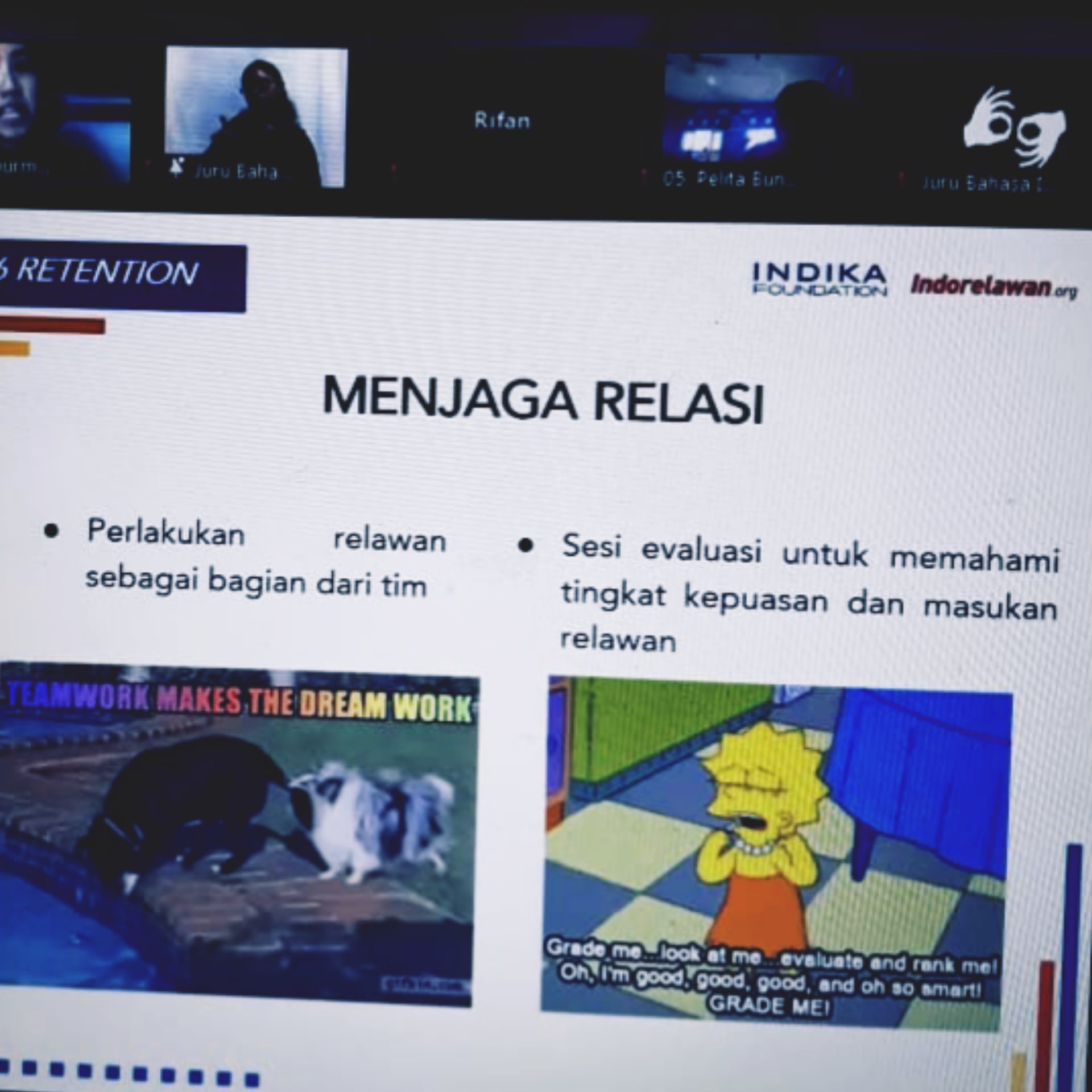 MALANG – Part 2. (selasa, 1 /12/2020). Pandemi Covid-19 yang merubah tatanan dunia tidak menyurutkan sebagian besar orang untuk belajar, kendatipun mereka tidak bisa tatap muka secara langsung bahkan bersalaman. Contoh kecil saja dari rangkaian  Bootcamp Indika Foundation! Digelar kelas tematik memperkuat materi yang sudah dipaparkan secara maraton mulai 2 – 6 November 2020 yang dikemas dalam Kelas Indika Foundation (Kinton) 1 sampai 4 session. Ulasan Kinton 1 yang telah diulas pada edisi Senin (9/11/2020) menjadi ajang “pendalaman” materi tematik yang bisa dipilih peserta Bootcamp dalam kelas-kelas terpisah sesuai minat dan fokus peserta. Pada Kinton 2 yang digelar pada 14 November 2020 tim LGI (lingkar Gagasan Indonesia) ikut serta dalam materi yang digelar dengan tema “Membuat & mengevaluasi strategi komunikasi” oleh Michael Chang, Founder Inspect History dan “Membuat konten yang berdampak dan menginspirasi di media sosial” oleh Adeste Adipriyanti, produser Eksekutif Narasi. Mereka mengulas tentang strategi komunikasi melalui media sosial untuk menarik publik untuk mengikuti konten dan pesan yang diusung. Di era milenial seperti sekarang ini media sosial sangat efektif untuk menyampaikan pesan maupun ajakan melalui konten-konten kreatif yang disuguhkan. Semua itu dijelaskan dengan ‘gamblang’ oleh kedua narasumber yang sudah expert di bidang content creator platform online tersebut. Peserta merasa mendapat banyak insight tentang materi ini terlihat banyaknya penanya yang antusias mengajukan pertanyaan seputar tema. Tidak ketinggalan tim LGI yang tidak menyia-nyiakan kesempatan ini untuk menambah khazanah menjaga relasipengetahuan tentang konten kreatif dalam komunikasi melalui media sosial.  Disela-sela rangkaian Kinton, tim IF juga membuka mentoring tugas pembuatan proposal dan materi lainnya yang dipandu oleh fasilitator kelas masing-masing. Dan serunya lagi mentornya juga langsung dilayani oleh pemateri utama di bootcamp. Pada 22 November digelar Kinton 3 dengan tema “ Bagaimana menciptakan ekosistem bekerja yang sehat” oleh Emilia Savira, Senior Officer for Monev Indika Foundation. Dan tema sesi kedua “ Mengatasi tantangan manajemen anggota dan relawan di Organisasi sosial  oleh Marsya Nurmaranti, Executive Director Indorelawan.